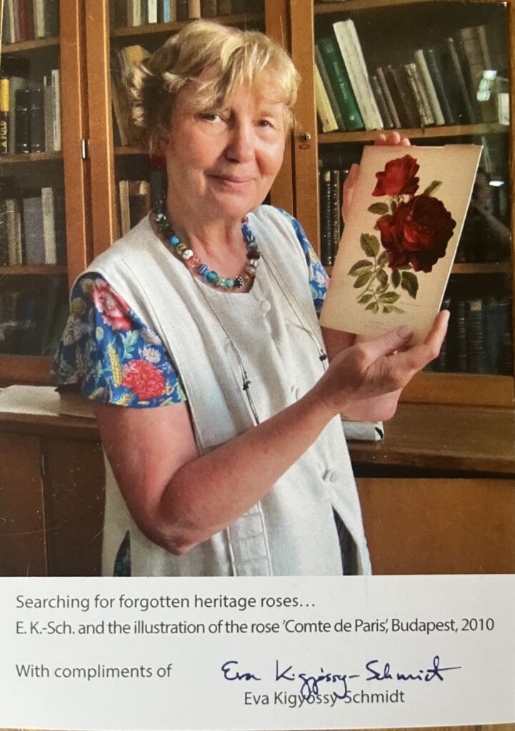 Eine engagierte und bestens mit dem Thema „Rosenzucht in Ungarn“ vertraute Rosenfreundin ist im November verstorben. Seit den 1990er Jahren hatte sie sich um die Rettung der Rosenzüchtungen des ungarischen Züchters Gergely Márk verdient gemacht, teilweise bis an die Grenze ihrer Körperkraft. Vielen Rosenfreundinnen und Rosenfreunden ist sie durch ihre Vorträge in den Freundeskreisen und in anderen Veranstaltungen sowie Artikeln in den Publikationen der Gesellschaft Schweizerischer Rosenfreunde, der Nederlandse Rozenverenigung und der Österreichischen Gartenbaugesellschaft bekannt. Auf Kongressen der World Federation of Rose Societies (WFRS) machte sie durch ihre Vorträge das Erbe von Gergely Márk weltweit publik. Viele der Márk – Sorten wachsen heute in privaten und öffentlichen Gärten. Für Eva war es immer ein Riesenaufwand, die aus Ungarn angelieferten Rosen zu sortieren, zu verpacken und an die Adressaten zu versenden.